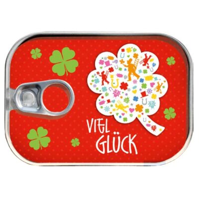 Aufwändig gestaltete Dosenpost 'Viel Glück'  Kleeblatt auf rotem Hintergrund