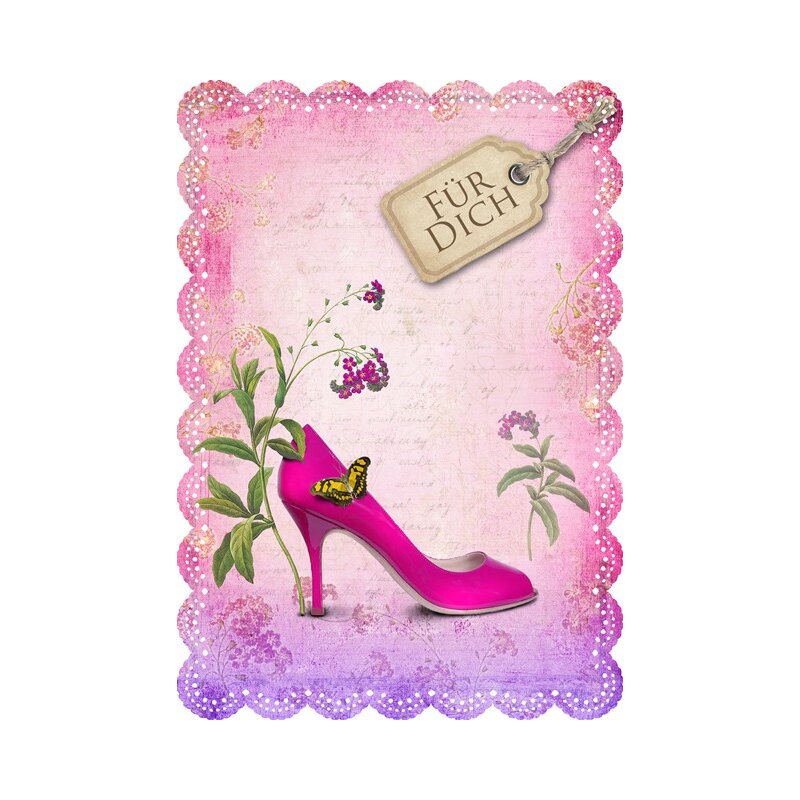 Aufwändig gestaltete Grußkarte 'Für Dich' - très chic mit Schmuckrand, Motiv: Rosa Schuh mit Blumen und Schmetterling inkl. passendem Briefumschlag