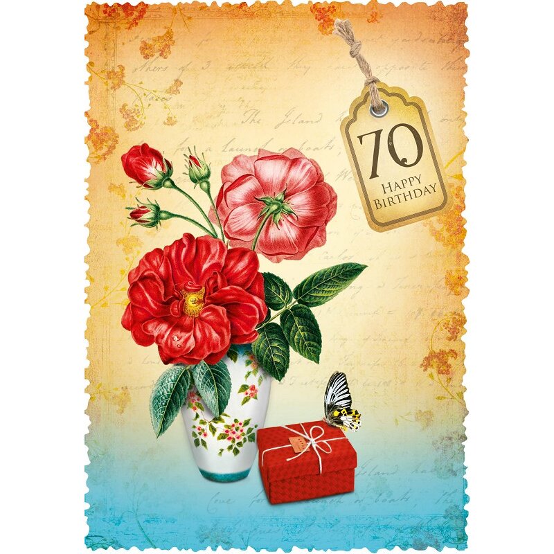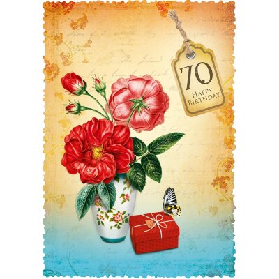 Aufwändig gestaltete Grußkarte  'Blume 70', Motiv: Blumenstrauß mit Geschenk, inkl. passendem Briefumschlag