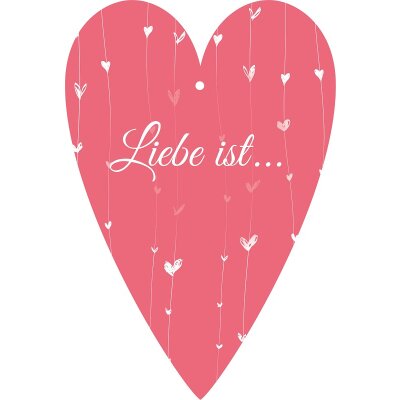 Roter Finnenholzkarton in Herzform, Aufschrift "Liebe ist..." mit Anhänger und passendem Briefkuvert.