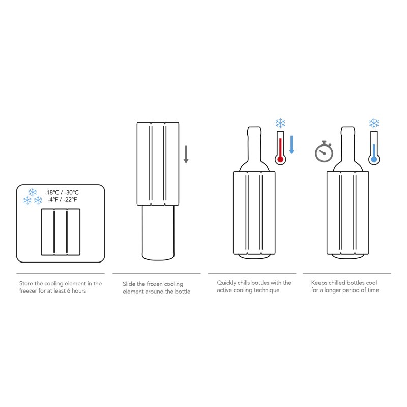 Kühlt den Wein schnell innerhalb von 15 Minuten und hält ihn bis zum letzten Schluck kühl. Die flexible Kühlmanschette hat isolierende Eigenschaften und liegt eng an der Flasche an.